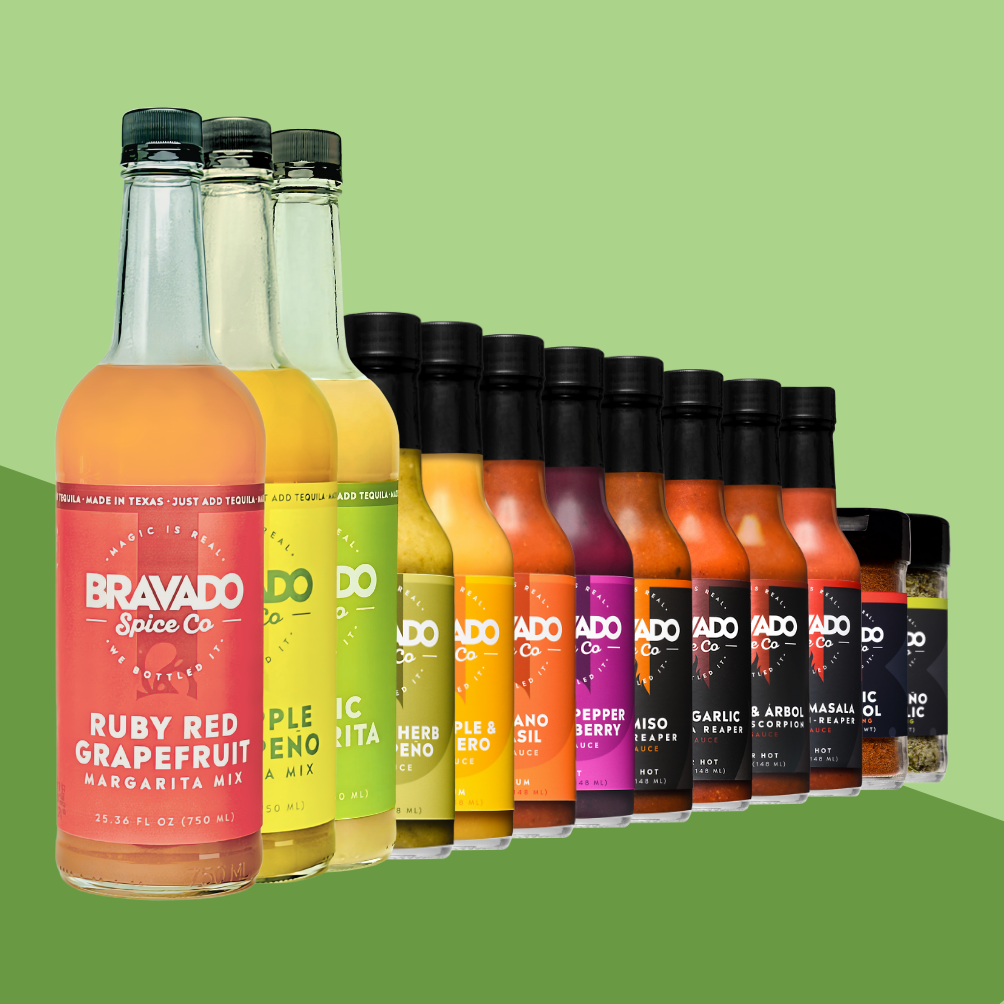 Experience the full Bravado Spice lineup with the Complete Collection Set. You get one of every hot sauce, seasoning, and margarita mixer we craft. From tropical cocktail blends to savory spices and high-risk super-hots, this is your ultimate flavor toolkit. Perfect for elevating dinner, drinks, and everything in between.